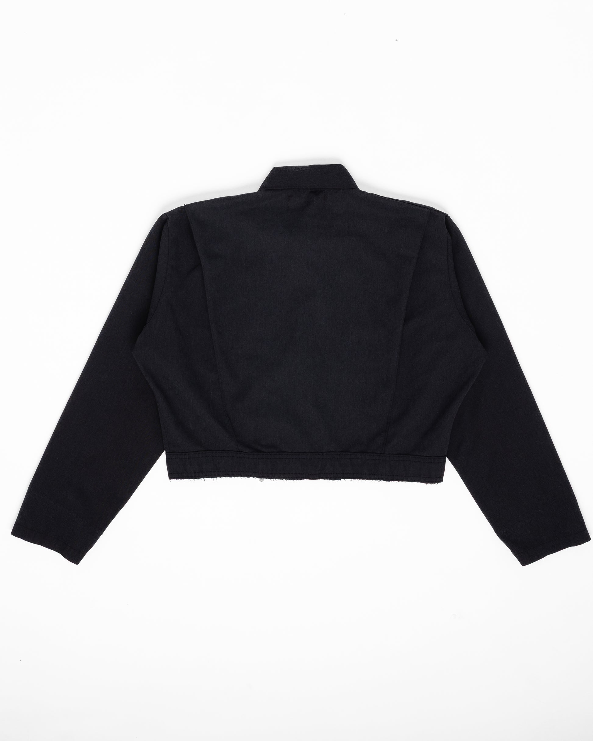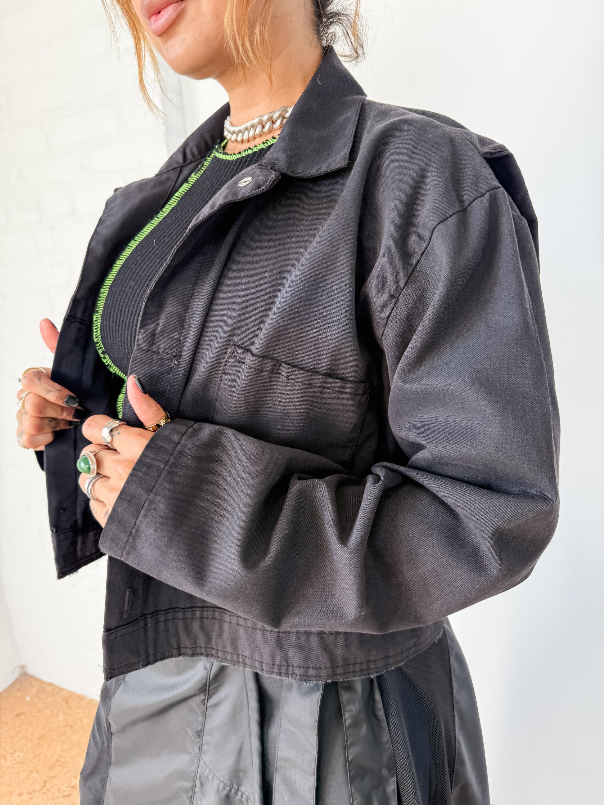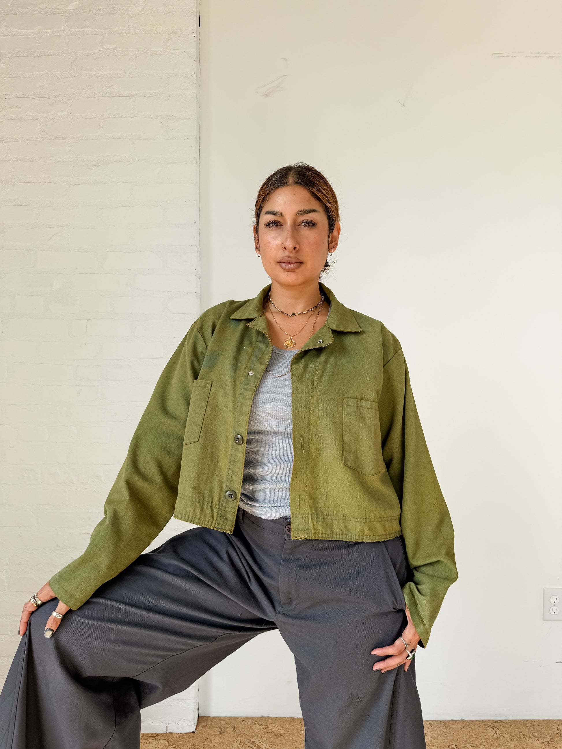 Constructed from vintage workwear with front snap closures, and front pockets. Boxy, slightly loose from the body. Each jacket is cut from vintage workwear that has been worn, worked in, and is recycled for you. Because each piece is completely repurposed, the exact fit will vary slightly. This is the power of reuse, you get a one-of-a-kind piece, no two alike.