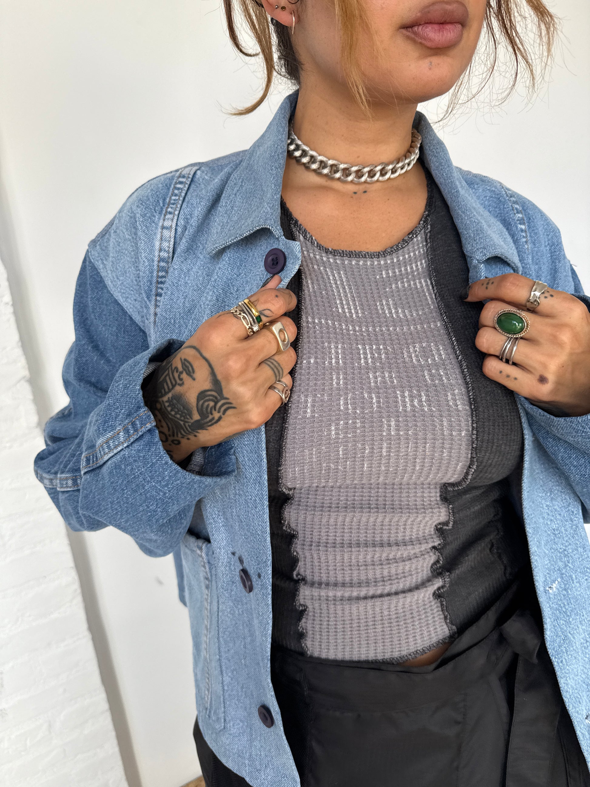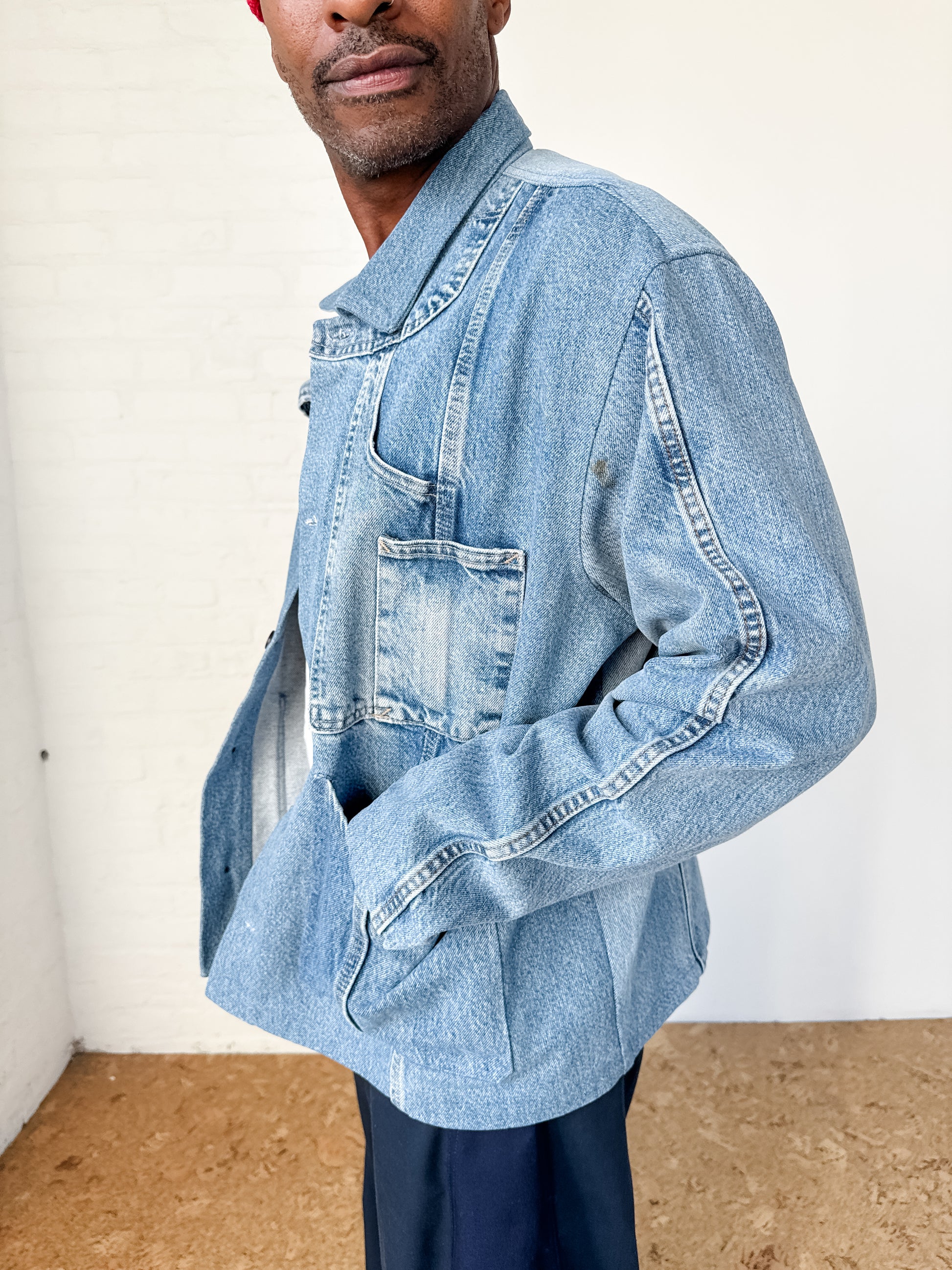 Front button closure with 2 oversized front pockets. Boxy, slightly loose from the body. Each jacket is cut from the same pattern and has the same fit, but because each jacket is made from completely unique upcycled denim, the exact fit will vary slightly. This is the power of reuse, you get a one-of-a-kind piece, no two alike.