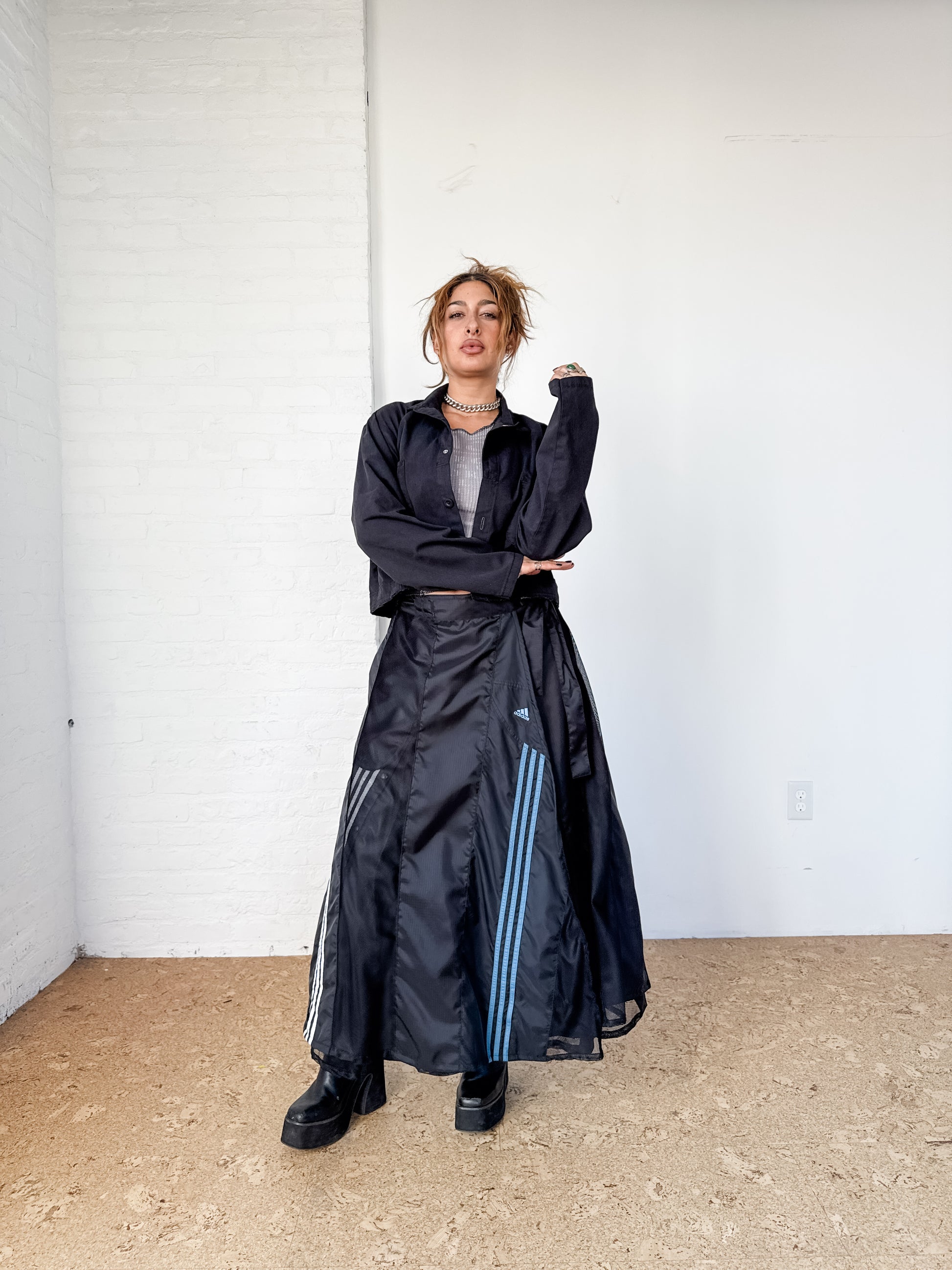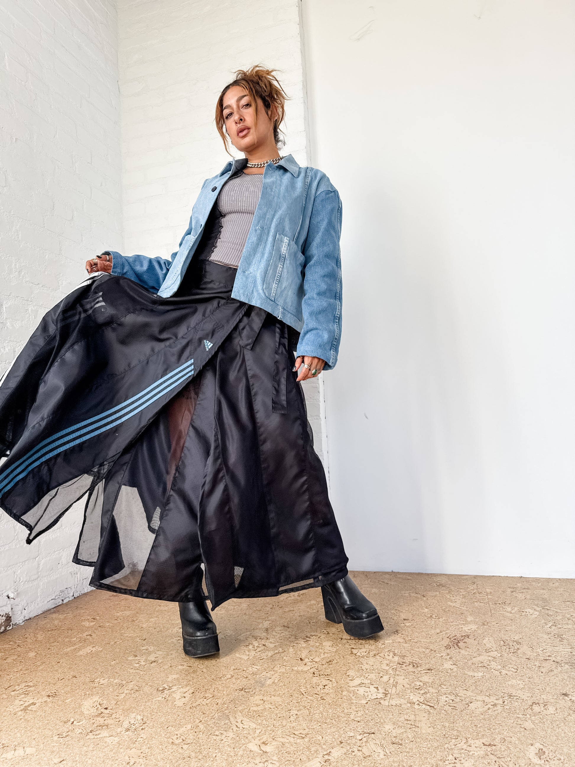 Remade wrap skirt upcycled from vintage track pants . Featuring an adjustable side tie closure and on-seam pockets.